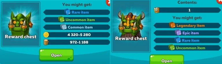 Truhe ist skalierbar. Die darin enthaltene Ausrüstung hängt vom Level deiner Kämpfer ab.