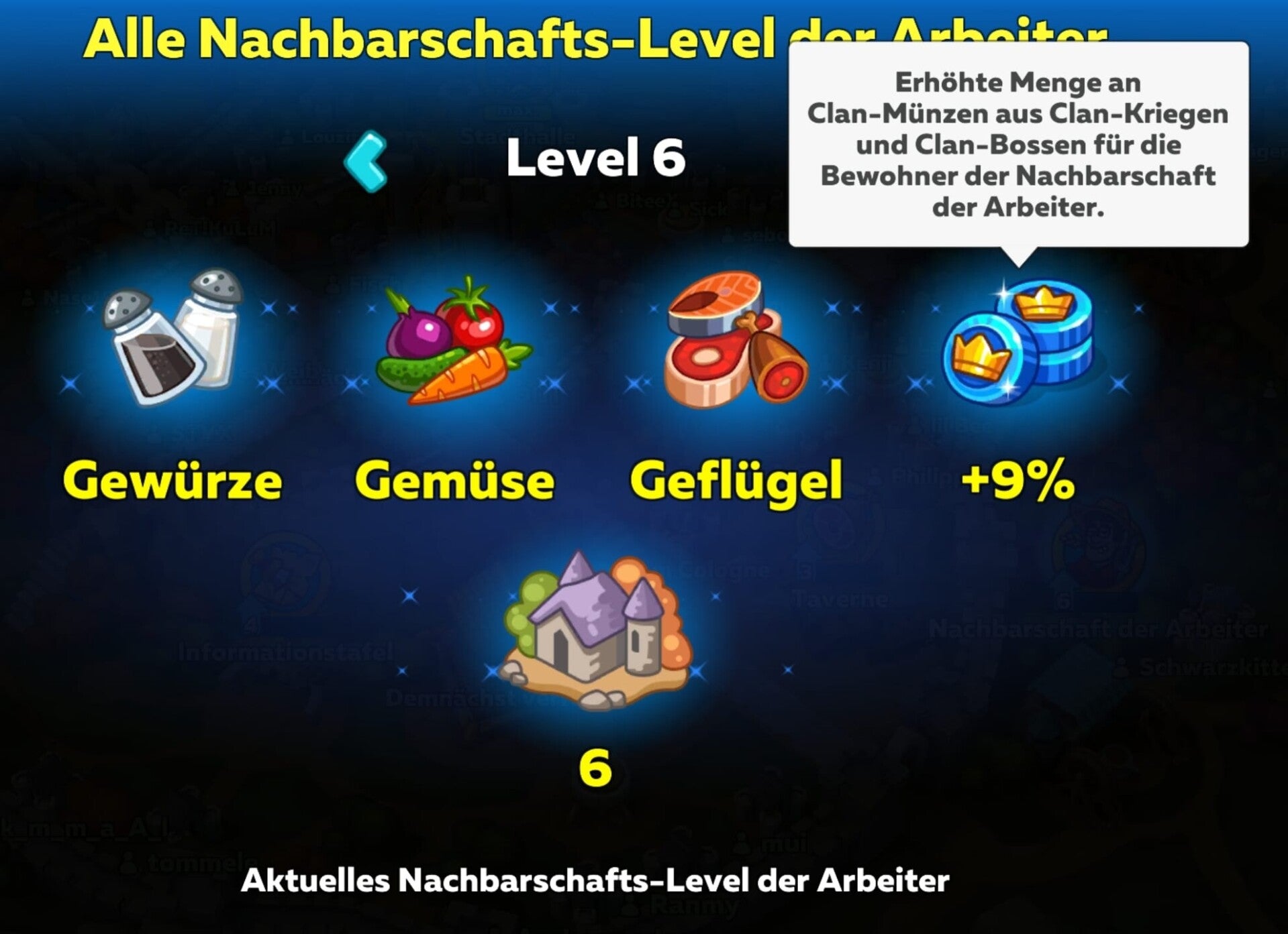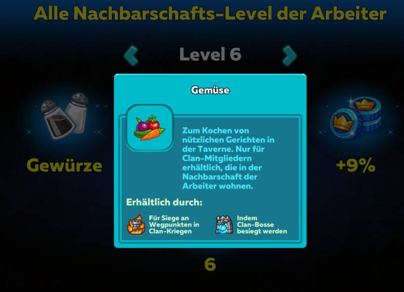 Erhöht bei Boss-Kämpfen und Clan-Kriegen die Clan-Münzen und man bekommt die Zutaten zum Kochen von Gerichten in der Taverne.